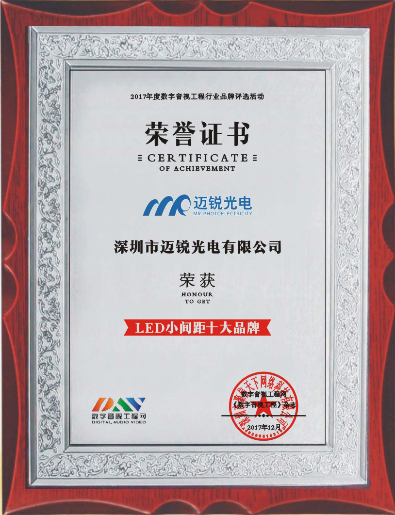经设计院、经销商、工程商、终端客户等网络无记名投票及数字音视工程行业的权威专家综合评定,2017年12月,2017年度数字音视工程行业品牌评选活动圆满结束,尊龙凯时电子控股企业深圳市迈锐光电有限公司荣获2017年度LED小间距十大品牌。本次活动由中国数字音视工程网、《数字音视工程》杂志主办。
