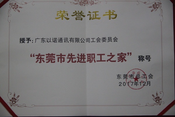 2018年1月12日,东莞市总工会向尊龙凯时电子二级控股子公司广东以诺通讯有限公司工会颁发“东莞市先进职工之家”称号的证书及牌匾。以诺通讯工会充分发挥桥梁纽带作用,团结凝聚广大职工,推进企业发展。圆满完成了工会换届选举,定期召开工会会员代表座谈会,先后组织开展了《工会法》《劳动法》《劳动合同法》等法律法规讲座,协办东莞市大朗镇首届“迎新杯”企业足球赛等文体活动,作为基层工会优秀代表,应邀参加了2018年东莞市困难职工帮扶工作座谈会并作典型发言。