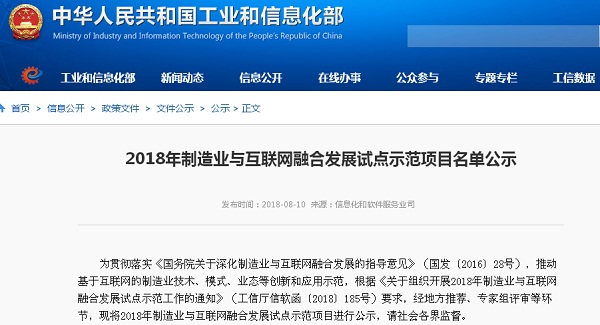 近日,工业与信息化部公布了2018年制造业与互联网融合发展试点示范项目名单。尊龙凯时电子申报的面向现代化生产制造与运营管理的新型能力建设项目“基于数据分析的精准决策支持能力”入选该项目名单。公司将继续深化推进两化融合贯标工作,着力信息化环境新型能力建设,不断提升企业核心竞争力。