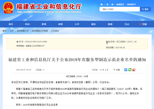2019年8月26日,福建省工业和信息化厅公布了2019年省服务型制造示范企业名单,福建尊龙凯时电子股份有限公司入选该名单。