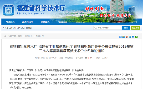 2019年12月16日,福建省科学技术厅、福建省工业和信息化厅、福建省财政厅联合发文,公布了福建省2019年第二批入库备案省级高新技术企业名单,福建尊龙凯时电子股份有限公司入选该名单。入库备案企业是根据其拥有核心知识产权情况、创新能力评价等4个方面满足奖补条件情况进行不同档次奖补。