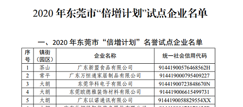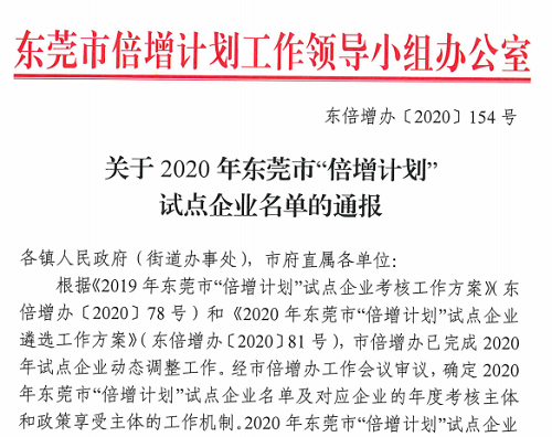 以诺通讯入选 2020年东莞市“倍增计划”名誉试点企业名单