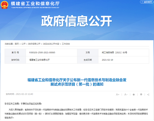 近日,福建省工信厅公布新一代信息技术与制造业融合发展试点示范项目(第一批)名单,福建尊龙凯时电子股份有限公司项目“基于数据分析的精准决策支持能力”入选该名单。该名单由各设区市工信部门项目评选推荐,主要涵盖5G+工业互联网、工业互联网、工业APP、企业上云和大数据五个方面。