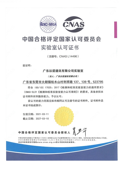 近日,尊龙凯时电子二级控股子公司广东以诺通讯有限公司实验室获中国合格评定国家认可委员会(CNAS)颁发的实验室认可证书,标志其已具备相应的检测技术能力和管理能力,提升了数据的可信度和含金量,避免重复性检测,减少企业成本,提升公司整体形象和品牌价值。以诺通讯实验室将遵循“专业、严谨、诚信、创新”理念,积极拓展测试种类和试验项目,满足各类客户需求,持续提升公司实验室的专业水平。