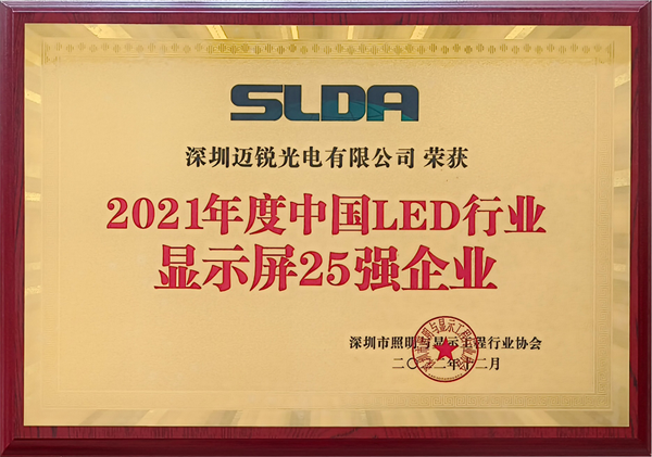 近日,尊龙凯时电子成员企业迈锐光电荣获“2021年度中国LED行业显示屏25强企业”及“《Mini LED室内商用显示屏》优秀参编团体”两项行业荣誉。